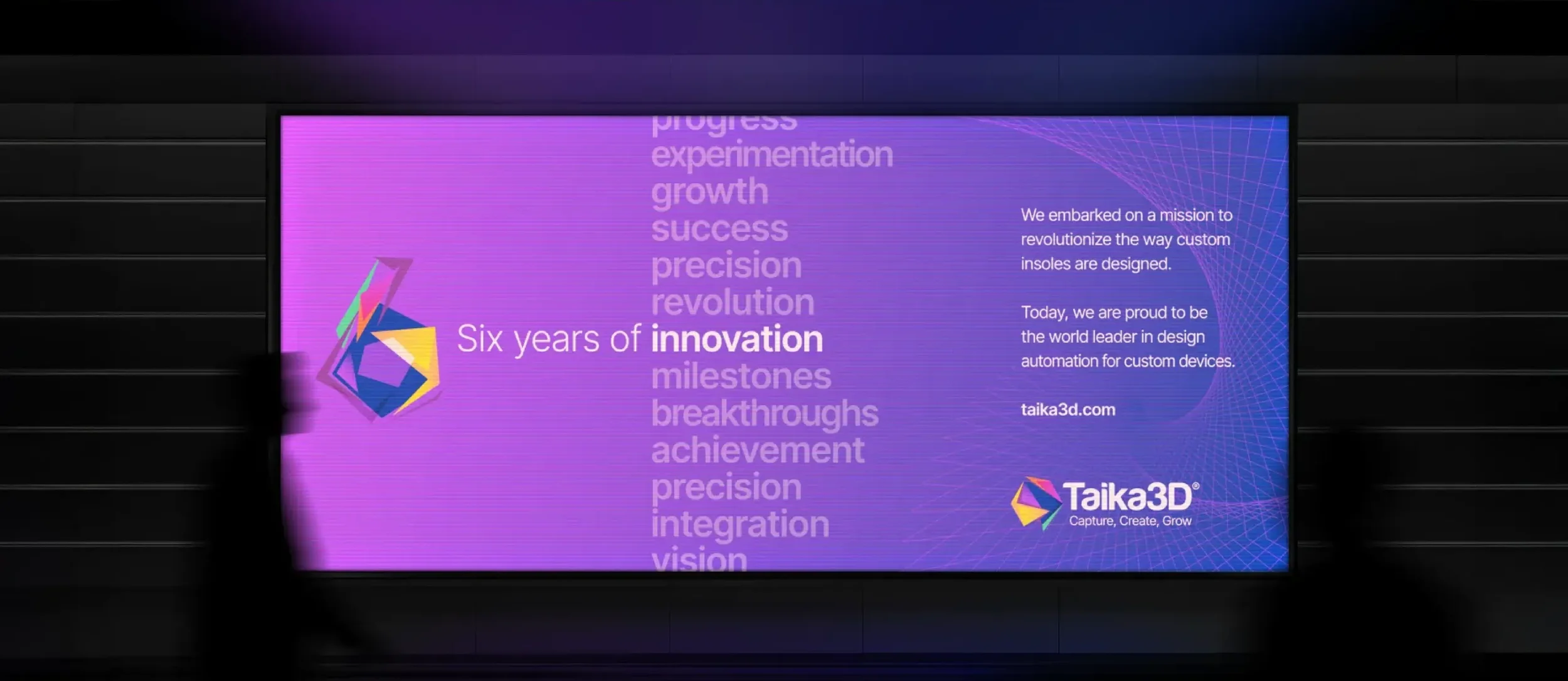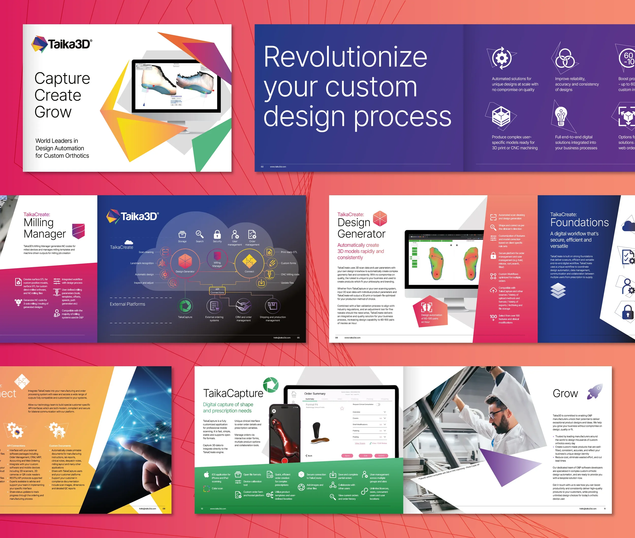 Taika3D came to us at a time when they were already world leaders in 3D design automation of orthotics, with an established client base across North America and Europe. But their existing look still had the feel of an emerging start-up. The brief from Taika3D was to adopt a process of ‘evolution’ rather than ‘revolution’, keeping the much-loved logo and strapline of ‘Capture, Create, Grow’ but moving the rest of the brand forward. Taika3D were now a world leader, so they needed to look like one. -