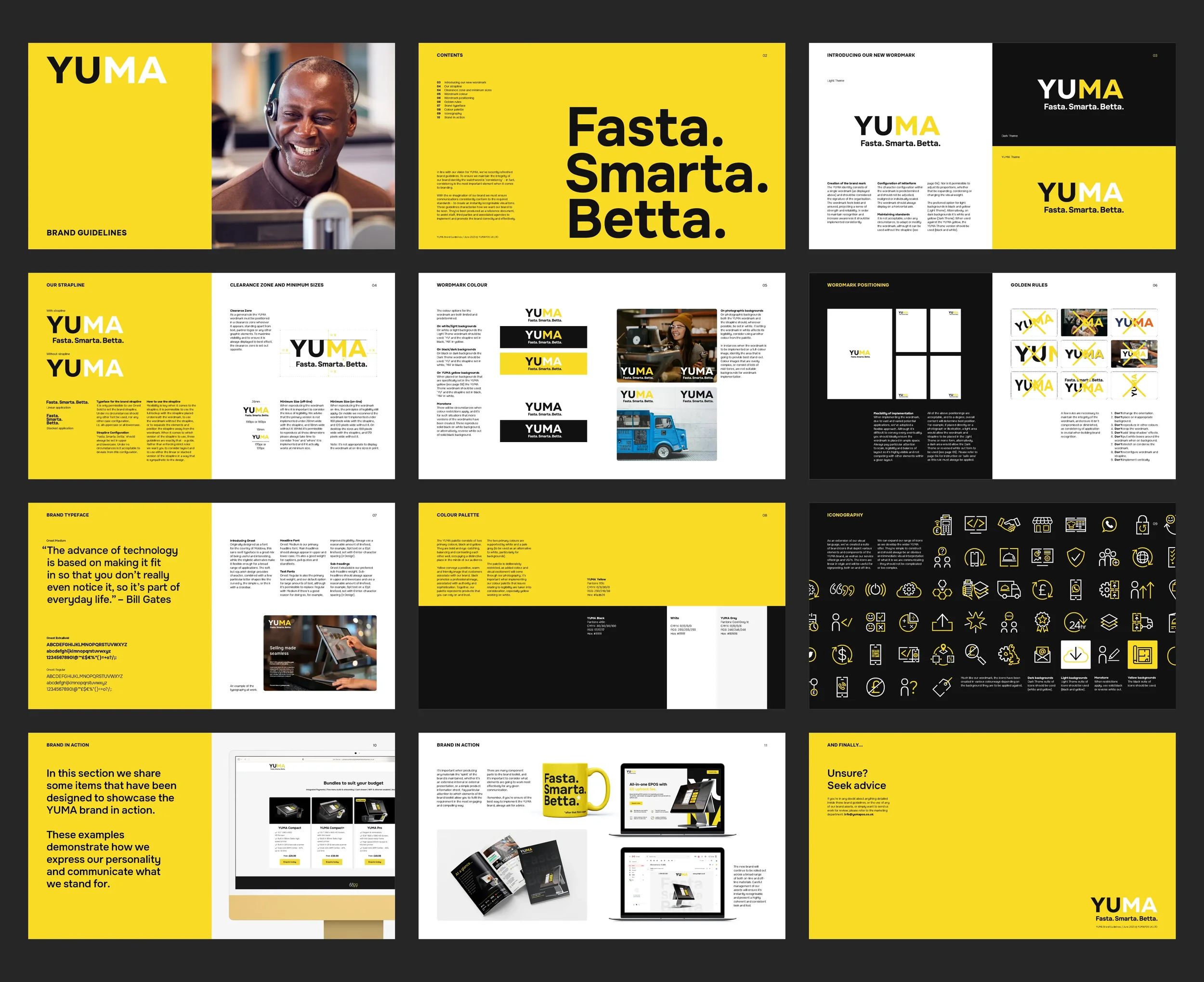 The identity was built around a single, confident wordmark designed to convey strength, reliability and ease of use. The retained yellow and black palette became central to the visual language: bold, eye-catching and practical. Yellow introduces warmth, approachability and energy, while black grounds the brand in professionalism and dependability. Together they reflect the balance at the heart of YUMA — friendly support backed by serious technology.